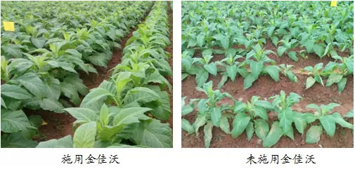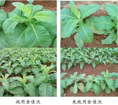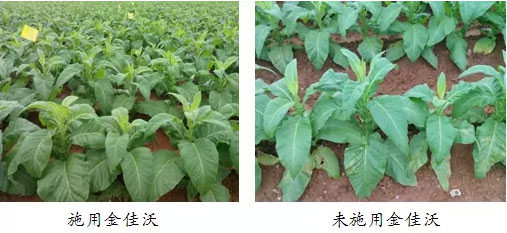 未施用金佳沃的煙草病害較多,煙農(nóng)大量噴施化學(xué)農(nóng)藥,導(dǎo)致煙葉卷曲、萎靡,而施用金佳沃的煙葉顏色深綠、寬大。